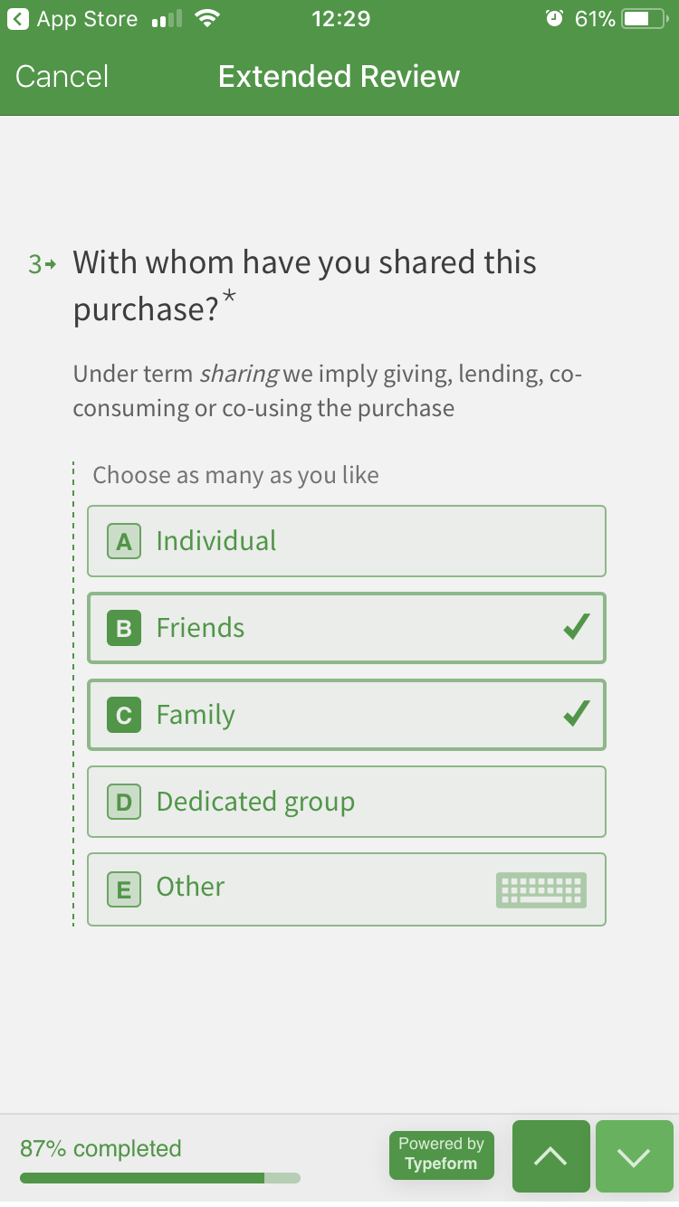In collaboration with a researcher from the University of Bristol, I recruited 71 participants to record their purchasing behavior with our app for one month. Using a mixed-methods analysis I, first, computationally identified how overall purchase satisfaction relates to its sharing; and, second, I elicited motivational and experiential factors that drive our participants’ sharing of everyday purchases.
