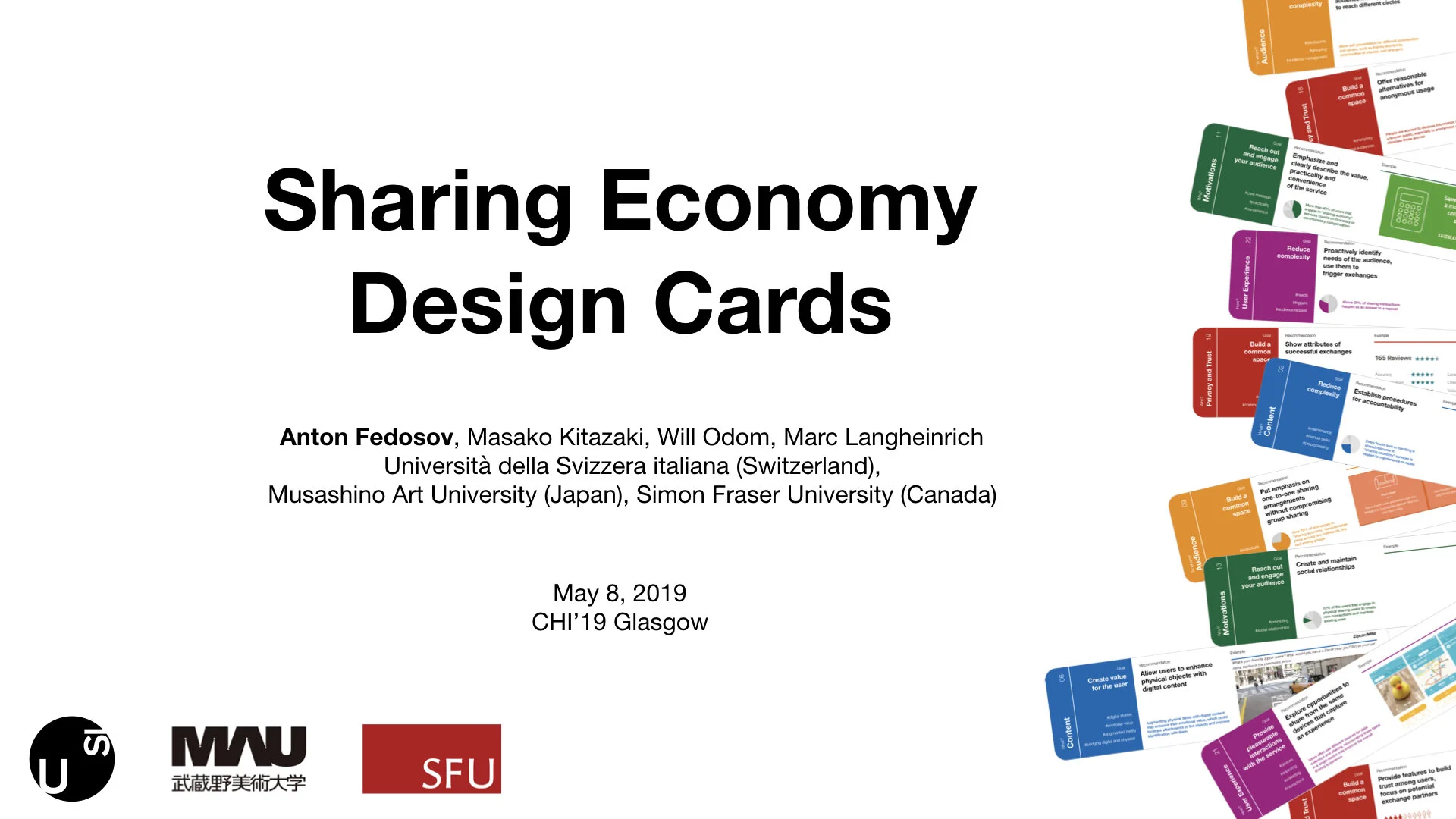 Anton Fedosov, Masako Kitazaki, William Odom, Marc Langheinrich (2019) Sharing Economy Design Cards, Proceedings of the 2019 ACM annual conference on Human Factors in Computing Systems - CHI '19, New York, New York, USA: ACM Press, url, doi:10.1145/3290605.3300375