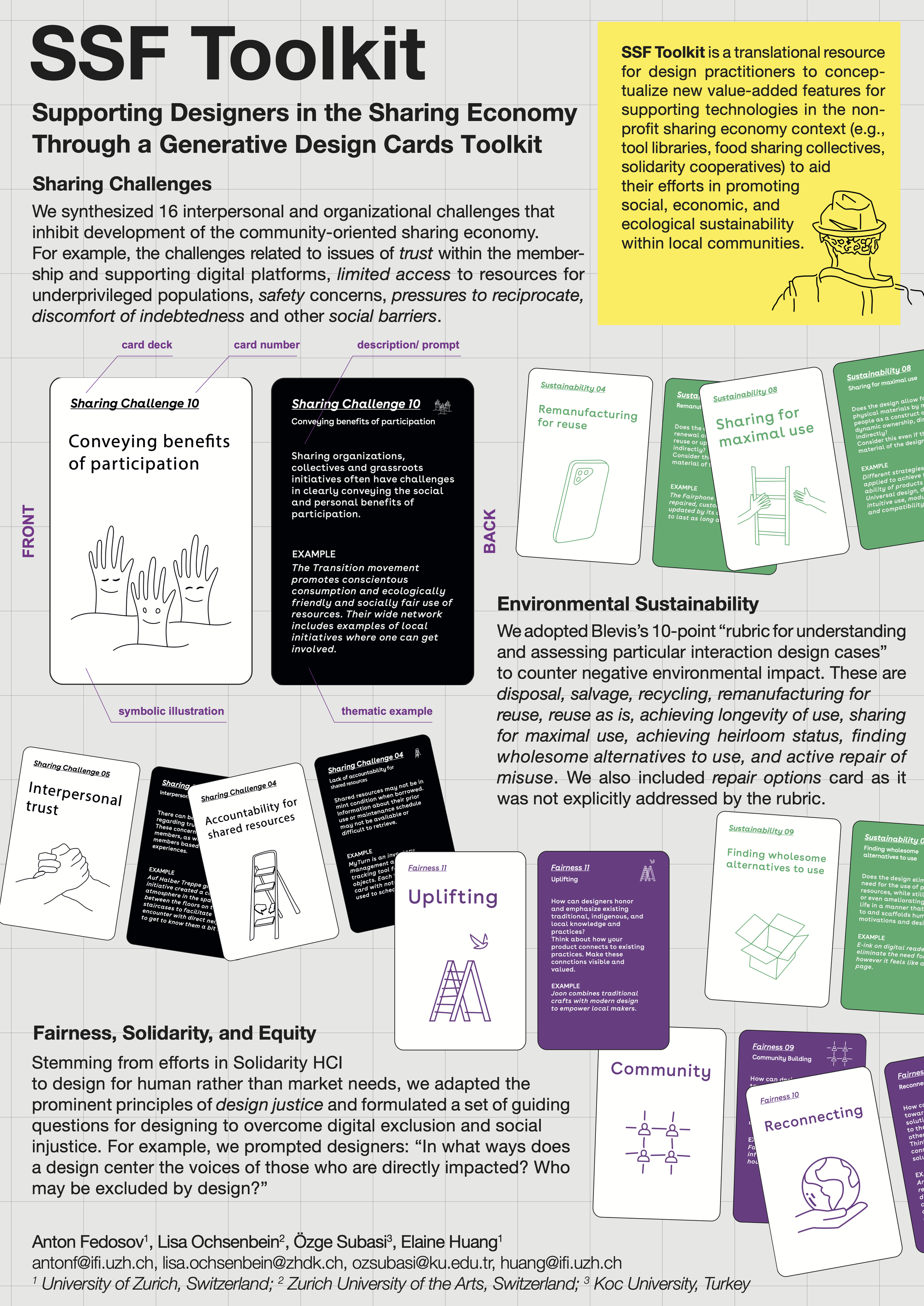 Anton Fedosov, Ozge Subasi, Lisa Ochsenbein, and Elaine Huang. (2022) Supporting Designers in the Sharing Economy Through a Generative Design Cards Toolkit. In Creativity and Cognition (C&C '22). Association for Computing Machinery, New York, NY, USA, 498–504. doi:10.1145/3527927.3535203, toolkit